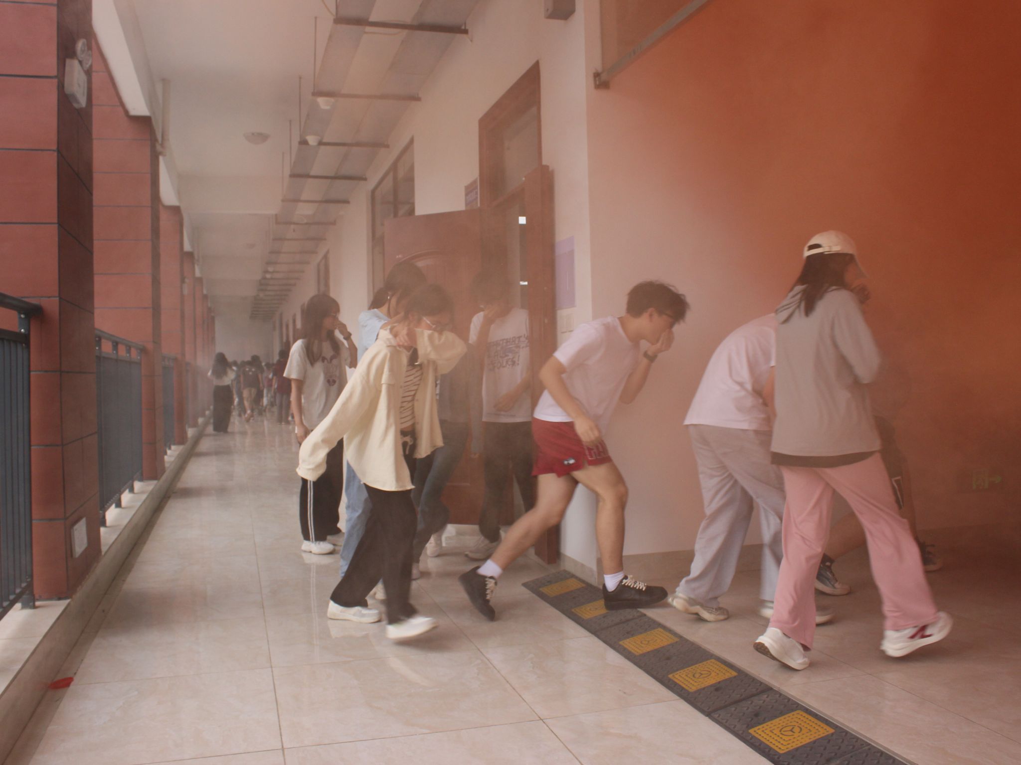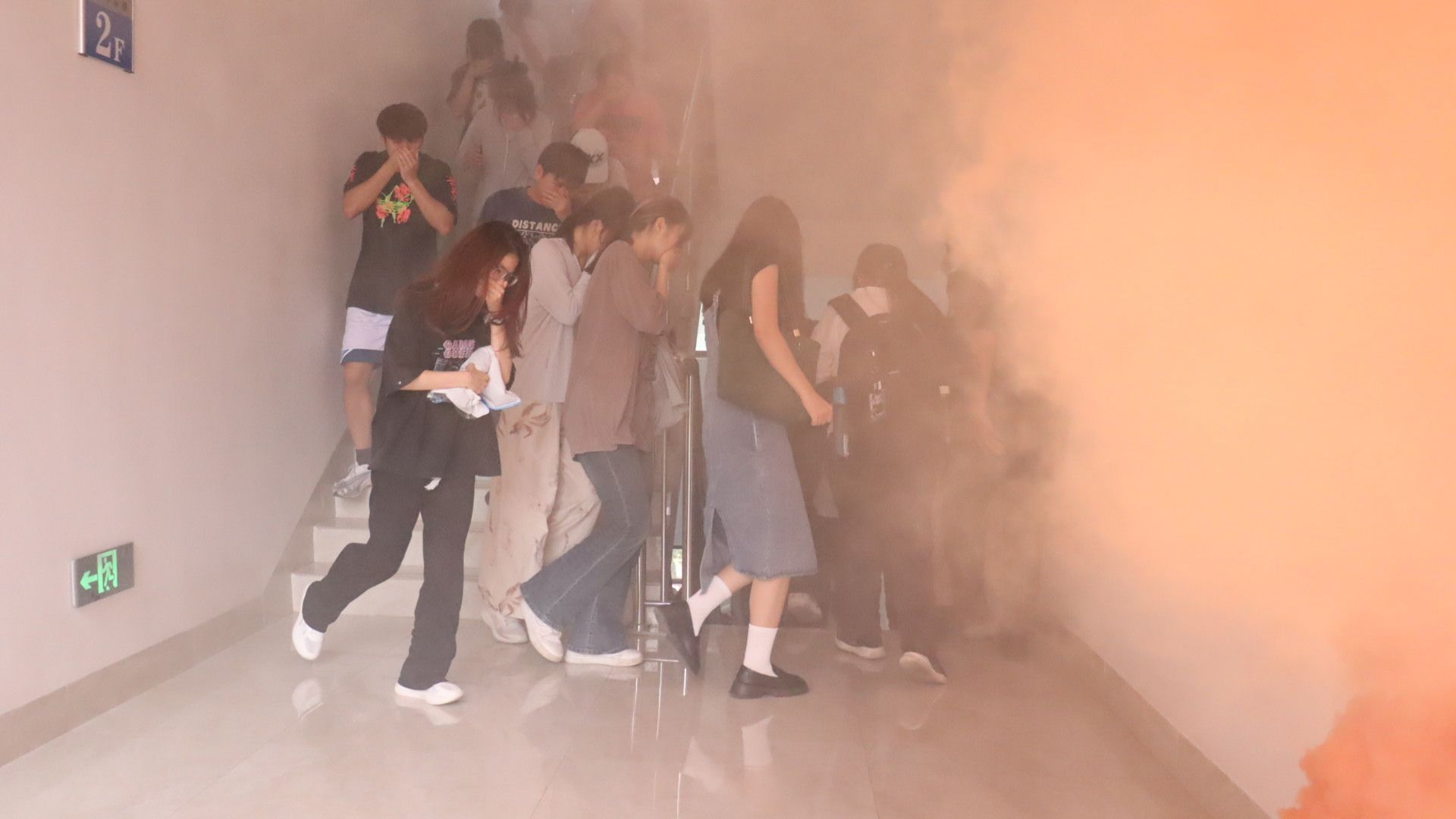 此次演练,由工作人员释放烟雾,模拟火场。随着烟雾燃放指令的发出,在教学楼各个教室的学生纷纷伏低身体,捂紧口鼻,迅速地从临近的消防安全通道有序疏散撤离。老师们在教室门外、消防安全通道等人群密集的地方,提醒学生沿着楼道右侧向楼下空地撤离,以防在人多慌乱之中发生踩踏事件,保证全体学生安全有序的到达空旷处。所有学生撤离到安全区域,整个疏散演练过程有条不紊,井然有序。