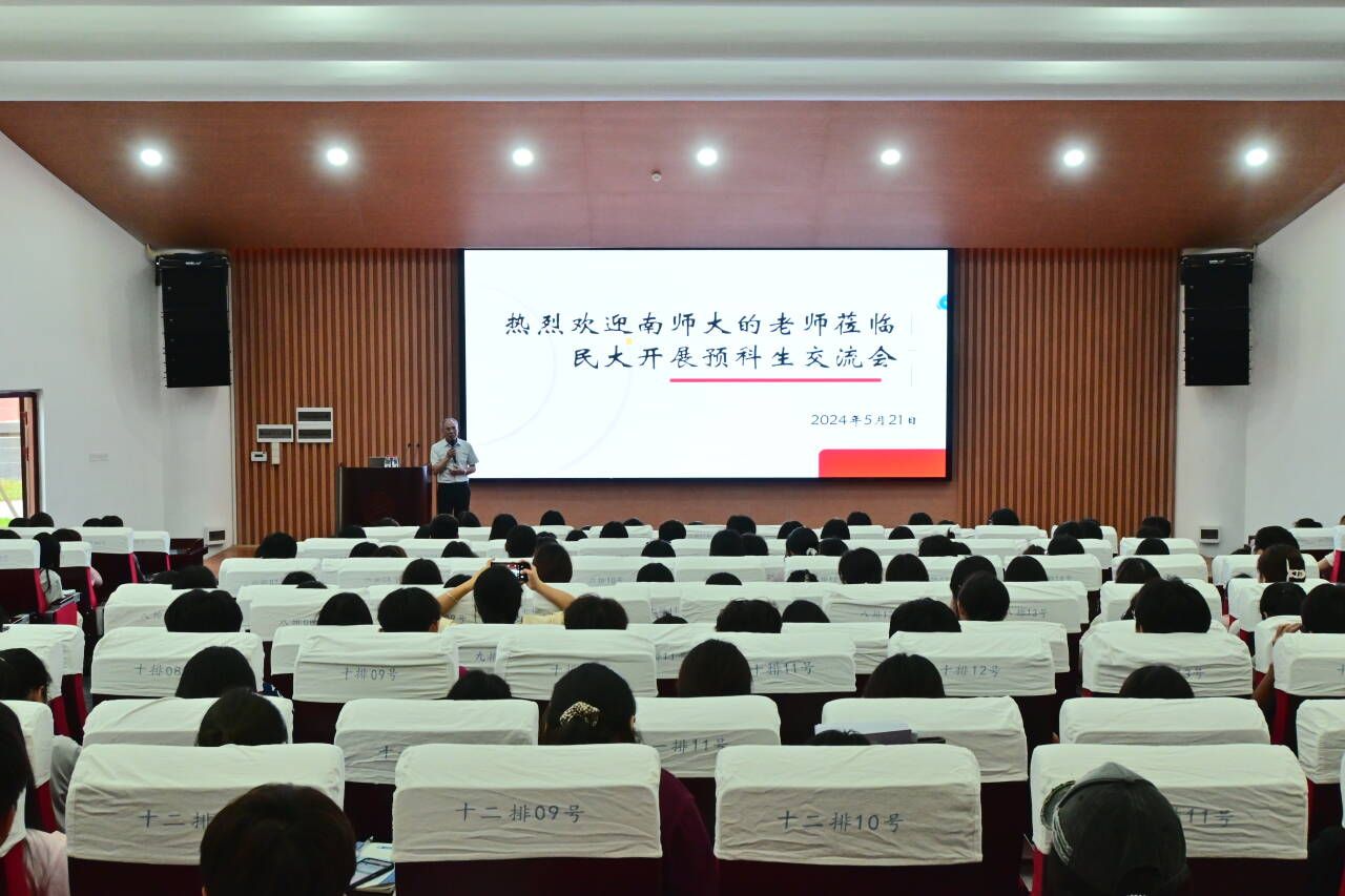5月21日,南宁师范大学招生就业处的闫位荣、杨洁、梁莹三位老师一行到FUN乐天使官方网站组织召开2024届少数民族预科班学生直升本科交流会,学院副院长牟永红参加交流会,南宁师范大学2024届全体预科生共同参与。