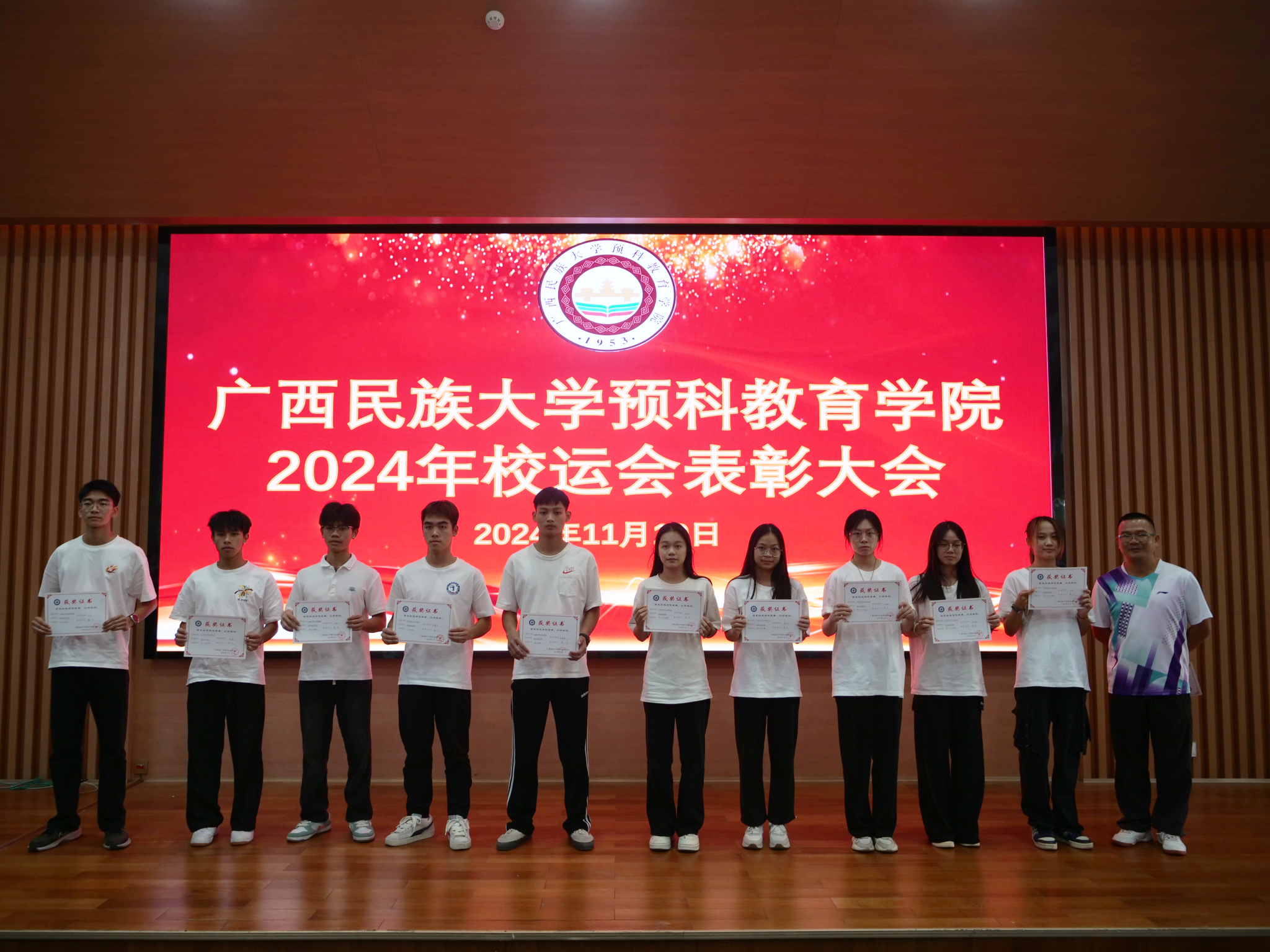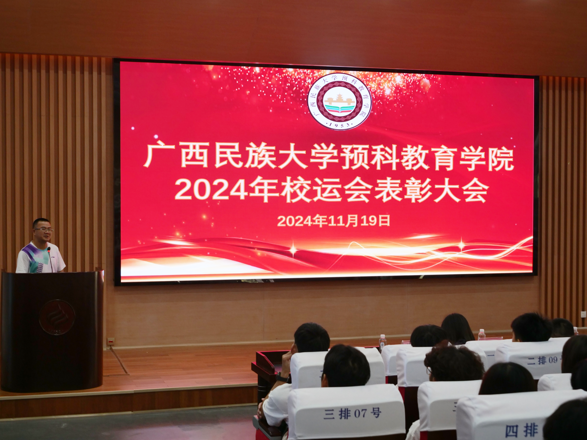 11月19日下午,FUN乐天使官方网站在武鸣校区椭圆报告厅举办2024年校运会获奖运动员表彰大会。学院副院长容浒熙,辅导员黄佳、苏钰、梁宇曦,以及2024级全体参赛运动员参加活动。