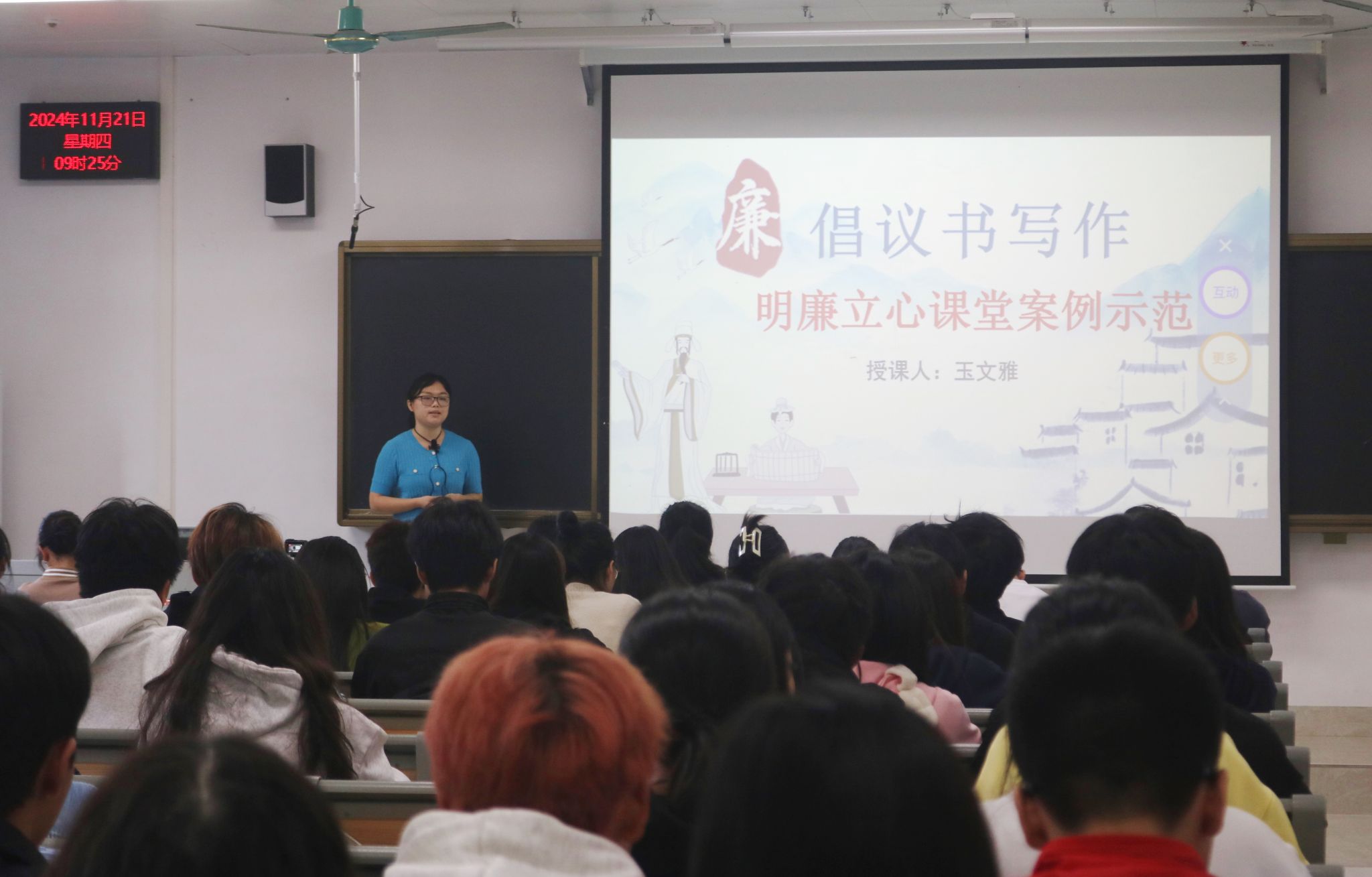 玉文雅从倡议书的基本结构、具体应用、人生启示三个方面,讲解了倡议书的写作方法。她以古今廉洁故事、优秀电视作品作为课程导入,引导同学们了解廉洁文化,深入理解其主要内涵。同学们通过课堂讨论的形式,积极互动、深入探讨,把廉洁自律的人生品格溶入写作课堂实践。在教师的指导下,同学们学习如何撰写倡议书并理解廉洁文化在校园中的重要作用。